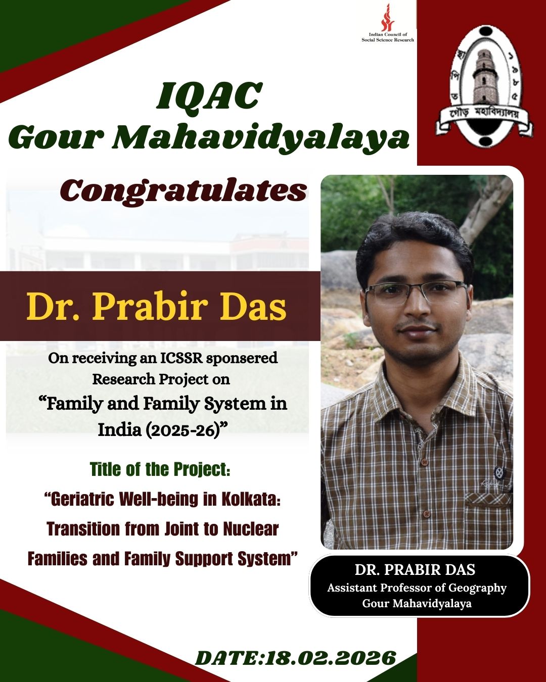 Dr. Prabir Das has been awarded an ICSSR Major Research Project in 2026.