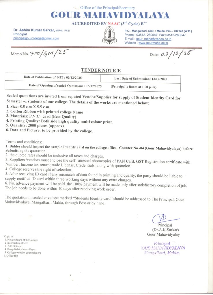 Tender Notice for Stuents Identity Card (1st Semester 2025-26)